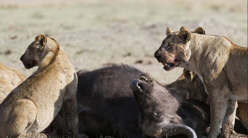 三头母狮子试图教小狮子如何捕食水牛,在摄影师的镜头中,水牛狂奔,而母狮跳到水牛的背上,露出其尖利的牙齿。另一张照片中,母狮紧抓住水牛的前腿,并用尖尖的爪子抓住水牛的背。幸运的是,这头重达500-1000公斤的南非水牛,最终成功脱离“狮口”,保存了性命。