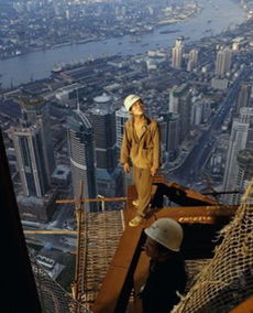 7月31日,香港红膦高楼外的两名工人在高空作业时突然刮起大风。