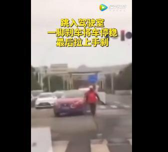 就在这个关键时刻,路过的外卖兄弟看到后,跑到车里,跳进驾驶室,刹车停车,最后拉上手刹,成功避免了事故。