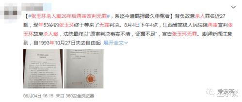 12月7日,张玉环和宋小女在江西南昌正式办理离婚手续。1993年,张玉环被判故意杀人罪,前妻宋小女被迫再婚。8月4日,法院宣布张玉环被无罪释放,宋小女说希望他能拥抱自己。到目前为止,他们仍然欠对方一个拥抱。