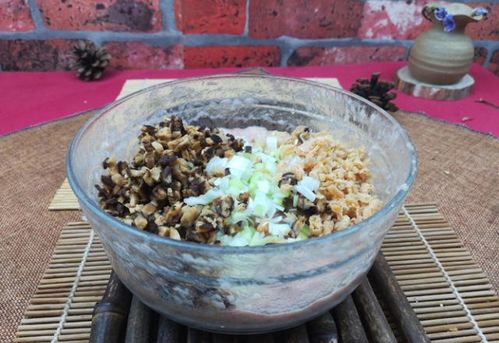 第九步:预备一个大碗,碗中参加适量提前泡发好的黑木耳、笋和丸子垫底,然后把切好的香肉摆上来。